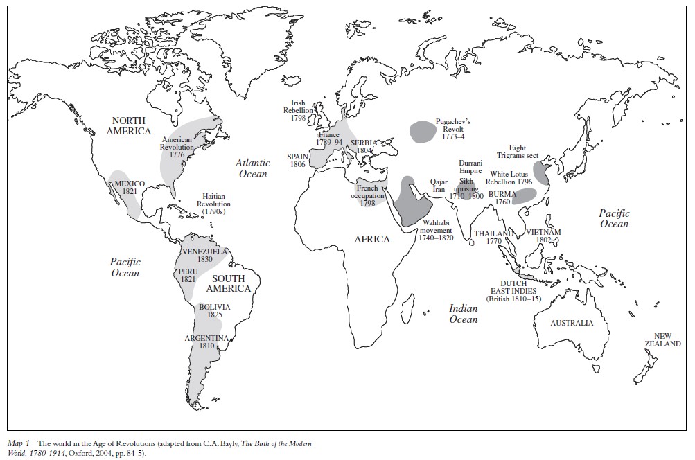 Cette approche n’est pas neuve, même si elle a été « oubliée ». Il faut repartir de l’étude monumentale en deux volumes de Robert R. Palmer, The Age of the Democratic Revolution (1959-1964), qui dépeint une série d’assauts contre l’aristocratie au nom de la démocratie, des Appalaches à l’Oural. Palmer a aussi collaboré avec l’historien français Jacques Godechot pour définir le concept de « révolution atlantique » dans les années 1950. Quelques années plus tard, dans The Age of Revolution, 1789-1848 (1962), Eric Hobsbawm met entre parenthèses la Révolution américaine et décrit plutôt les effets combinés de la Révolution française et de la Révolution industrielle britannique comme « le cratère jumeau d’un […] volcan régional » situé dans le nord-ouest de l’Europe. Son éruption initiale a été régionale mais le panache de fumée a eu des conséquences mondiales.